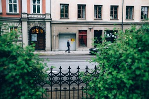 A lone figure in a dark suit wanders down a quiet street, flanked by quaint buildings that exude a charming historical vibe. The soft, diffused light creates a moody atmosphere, highlighting the contrast between the greenery in the foreground and the urban backdrop. The iron gate frames the scene, adding a sense of enclosure and inviting viewers to ponder the subject's journey.