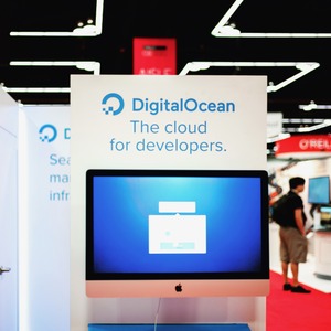The photograph captures a sleek DigitalOcean display featuring a modern computer setup, emphasizing its role as a cloud service for developers. Bright, overhead lighting enhances the clean, minimalist design, filling the space with a bright and inviting atmosphere. Soft focus on the background highlights intrigued attendees, creating a sense of engagement and curiosity about technology's future.