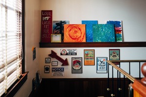 This photograph captures a cozy corner of an entryway adorned with vibrant local artwork and quirky signs. The warm, natural light streaming through the blinds creates a welcoming ambiance, contrasting with the colorful paintings and eclectic posters. The arrangement of art and signage draws the eye upward, inviting exploration and curiosity.