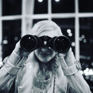 In a striking monochrome setting, a mysterious figure peers through binoculars, their face obscured yet curious. The soft lighting and blurred background create an intimate atmosphere, evoking a sense of intrigue and exploration. The glossy, transparent jacket contrasts with the dark surroundings, adding an edgy feel to the composition.
