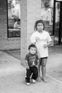 In this black-and-white photograph, two children stand side by side outside a casual dining establishment, framed by a brick pillar. The older girl’s serious expression contrasts with the younger boy’s playful demeanor, creating a poignant glimpse into their bond amid a backdrop of everyday life. Soft lighting enhances the mood, evoking a sense of innocence and the complexities of sibling relationships.