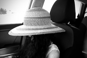 In a monochromatic setting, a young girl rests in a car’s passenger seat, her face obscured by a wide-brimmed straw hat. The soft, diffused light creates a serene atmosphere, contrasting with the sharp lines of the car's interior. This intimate composition evokes feelings of nostalgia and tranquility, capturing a fleeting moment of quiet reflection.