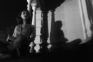 In this striking black-and-white photograph, a woman sits contemplatively on a porch, her expression a blend of vulnerability and introspection. The interplay of light and shadows creates an ethereal mood, casting her silhouette alongside contrasting architectural elements. The low lighting enhances the intimate atmosphere, drawing the viewer into a moment frozen in quiet reflection.