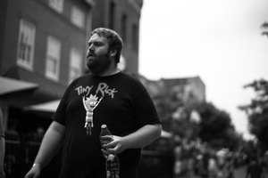 A man walks through a bustling street, captured in striking black and white. His expression conveys a mix of contemplation and engagement, set against a blurred backdrop of community life. The soft, overcast lighting adds a layer of introspection, enhancing the mood of solitude amidst the crowd.