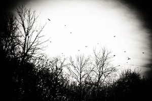 A stark black and white photograph captures the fluttering silhouettes of birds against a vast, overcast sky. The barren trees frame the scene, their stark branches reaching upward, enhancing the mood of solitude and freedom. The contrast of light and dark creates a haunting beauty, evoking a sense of tranquility intertwined with the fleeting nature of life.