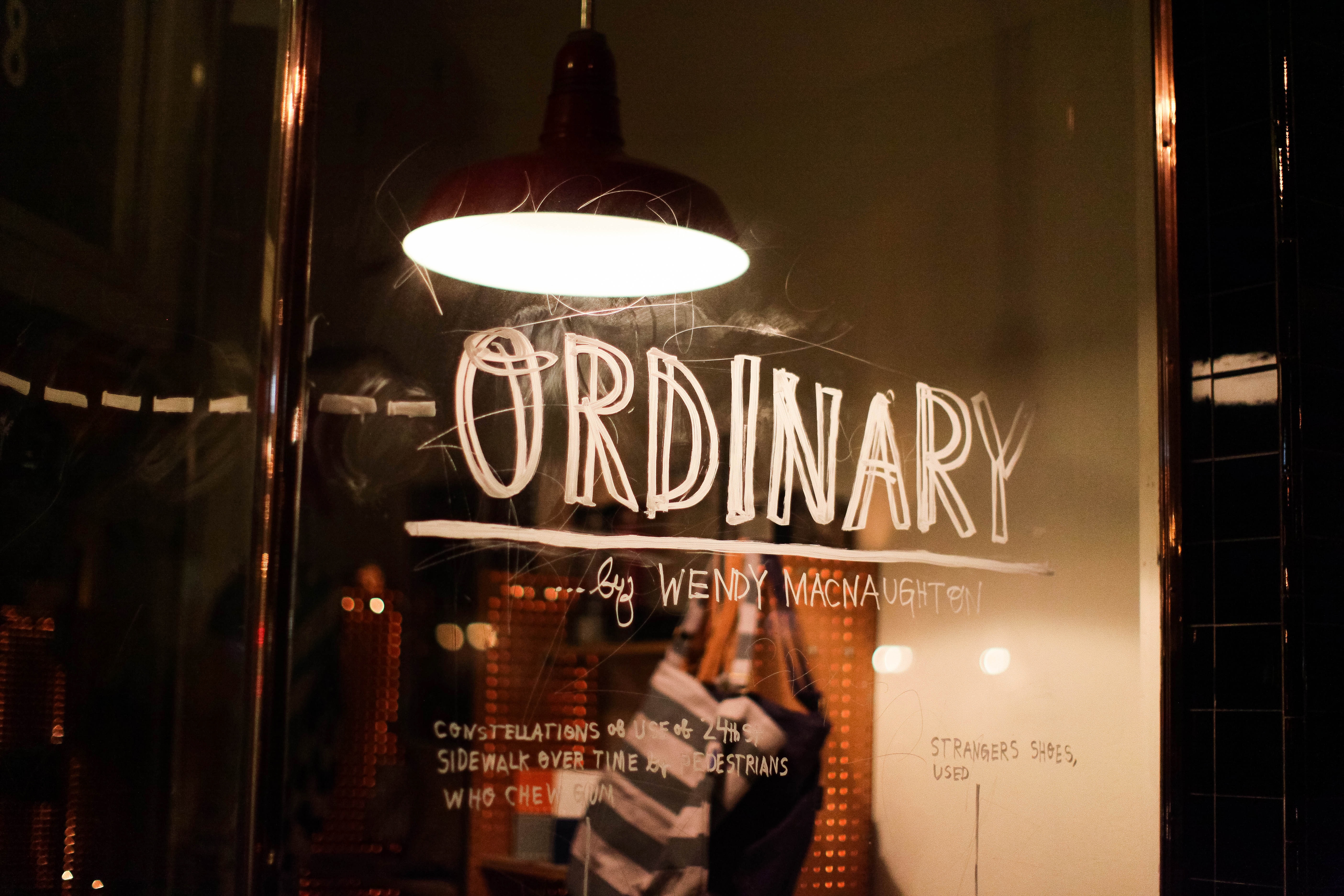 The photograph captures a glowing sign reading "ORDINARY" against a dimly lit backdrop, evoking a sense of curiosity and introspection. The warm light above casts soft shadows, inviting viewers to ponder the everyday stories encapsulated in the text. Subtle reflections add depth, merging the art with the lively ambiance of a nearby crowd.