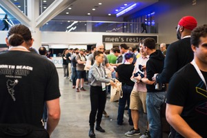 A bustling crowd lines up in a spacious, modern venue, captured in a moment of anticipation and connection. Soft, overhead lighting illuminates the scene, highlighting engaged conversations and a diverse group of attendees, while the sleek architecture adds a contemporary feel. The atmosphere is vibrant yet focused, embodying the energy of a professional gathering.