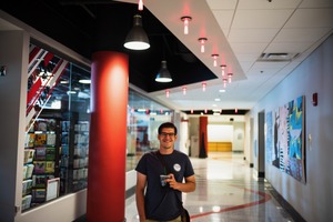 The photograph captures a young man standing confidently in a modern corridor, framed by contemporary lighting and vibrant artwork. The warm glow of hanging bulbs creates a welcoming atmosphere, while the sleek design elements accentuate a lively yet relaxed environment. His cheerful demeanor adds to the sense of community within this inviting space.
