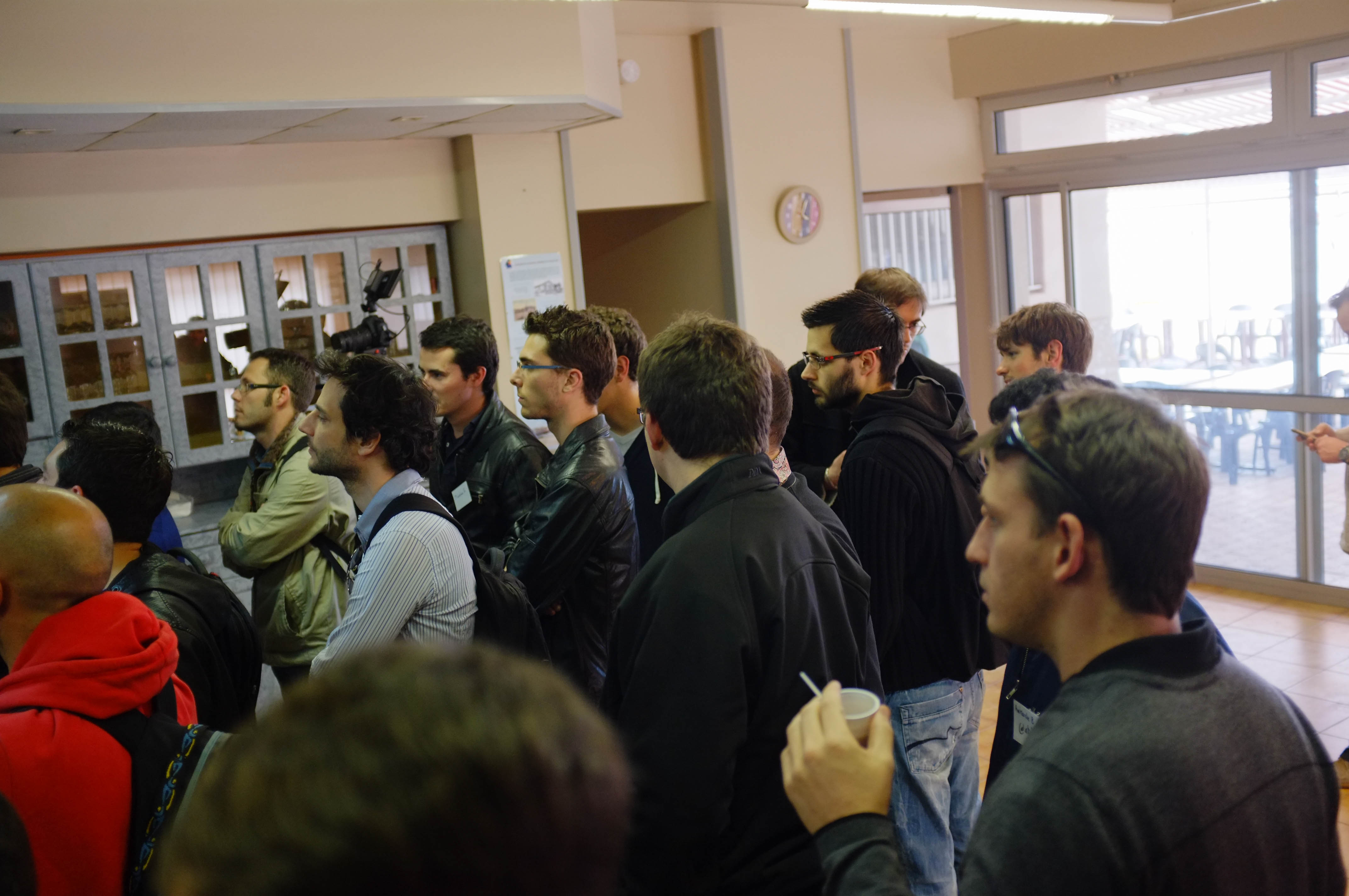 A diverse group of individuals stands clustered together in a casual indoor setting, focused and attentive. The warm, natural light filters in, creating a relaxed atmosphere while subtle expressions of curiosity and contemplation are evident on their faces. The composition draws the viewer’s eye to the varied expressions and postures of the attendees, enhancing the mood of engagement and anticipation.