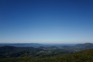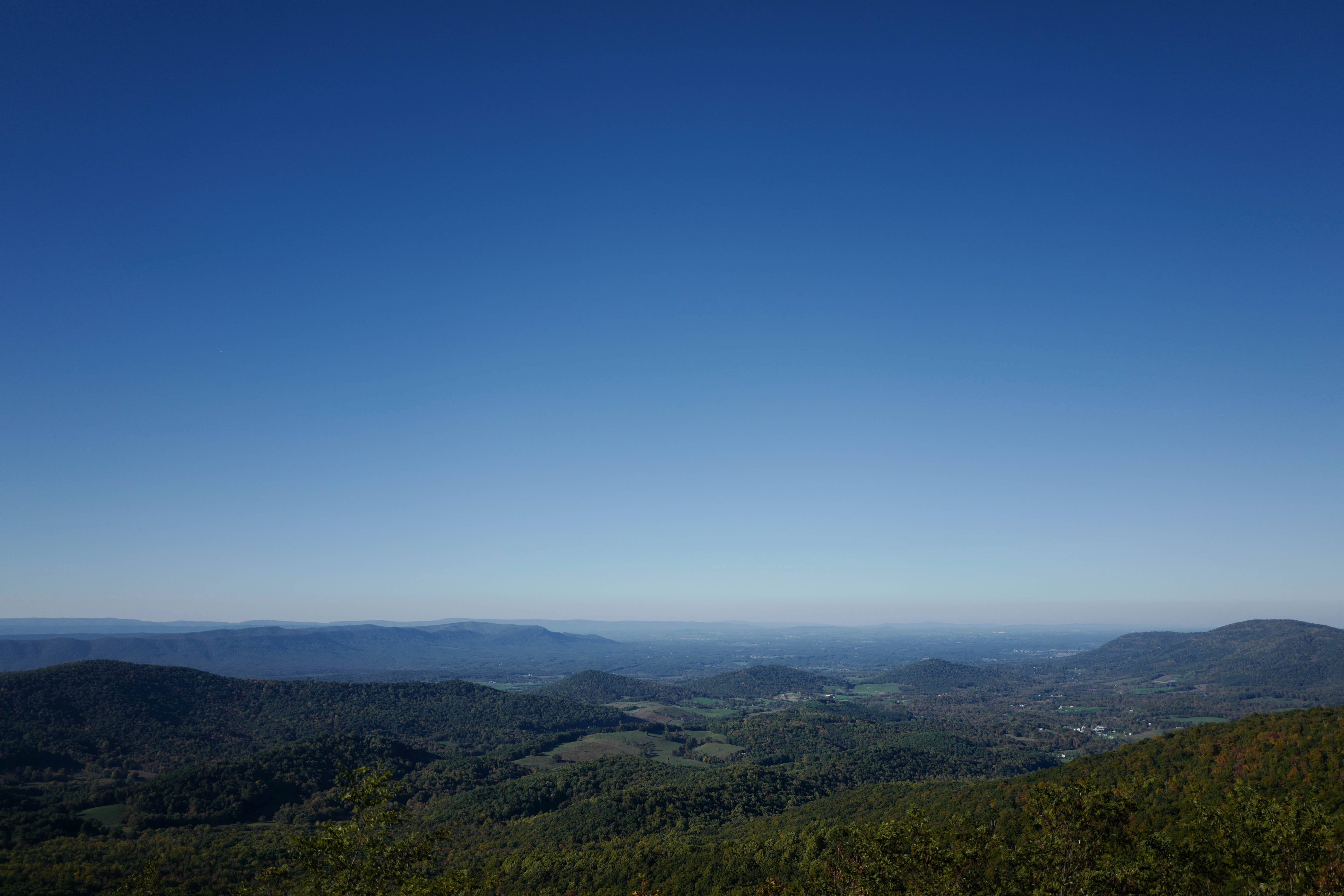 This sweeping landscape captures rolling green hills under a vast, cloudless sky. The serene mood is enhanced by soft, natural lighting that fills the scene with warmth, evoking a sense of peace and tranquility. The composition draws the eye towards the distant mountains, inviting contemplation and a connection with nature's grandeur.