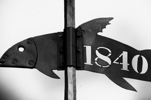 The photograph captures a striking piece of metal art shaped like a fish, prominently featuring the year '1840.' Its bold silhouette contrasts against a soft, light background, embodying a sense of history and craftsmanship. The monochrome palette imbues the scene with a timeless quality, evoking nostalgia and curiosity.