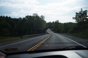 The photograph captures a winding road stretching into the horizon, framed by lush greenery on either side. Soft, diffused light filters through the clouds, creating a serene and inviting atmosphere that beckons exploration. The gentle curve of the road adds a sense of movement, drawing the viewer into the tranquil landscape.