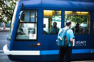 In this photograph, a lone figure stands facing a blue tram, eagerly waiting to board while listening to music. The warm, inviting glow from the inside of the tram contrasts with the cool exterior, creating a sense of anticipation and connection. The composition captures a quiet moment in urban transit, highlighting the everyday stories that unfold in city life.