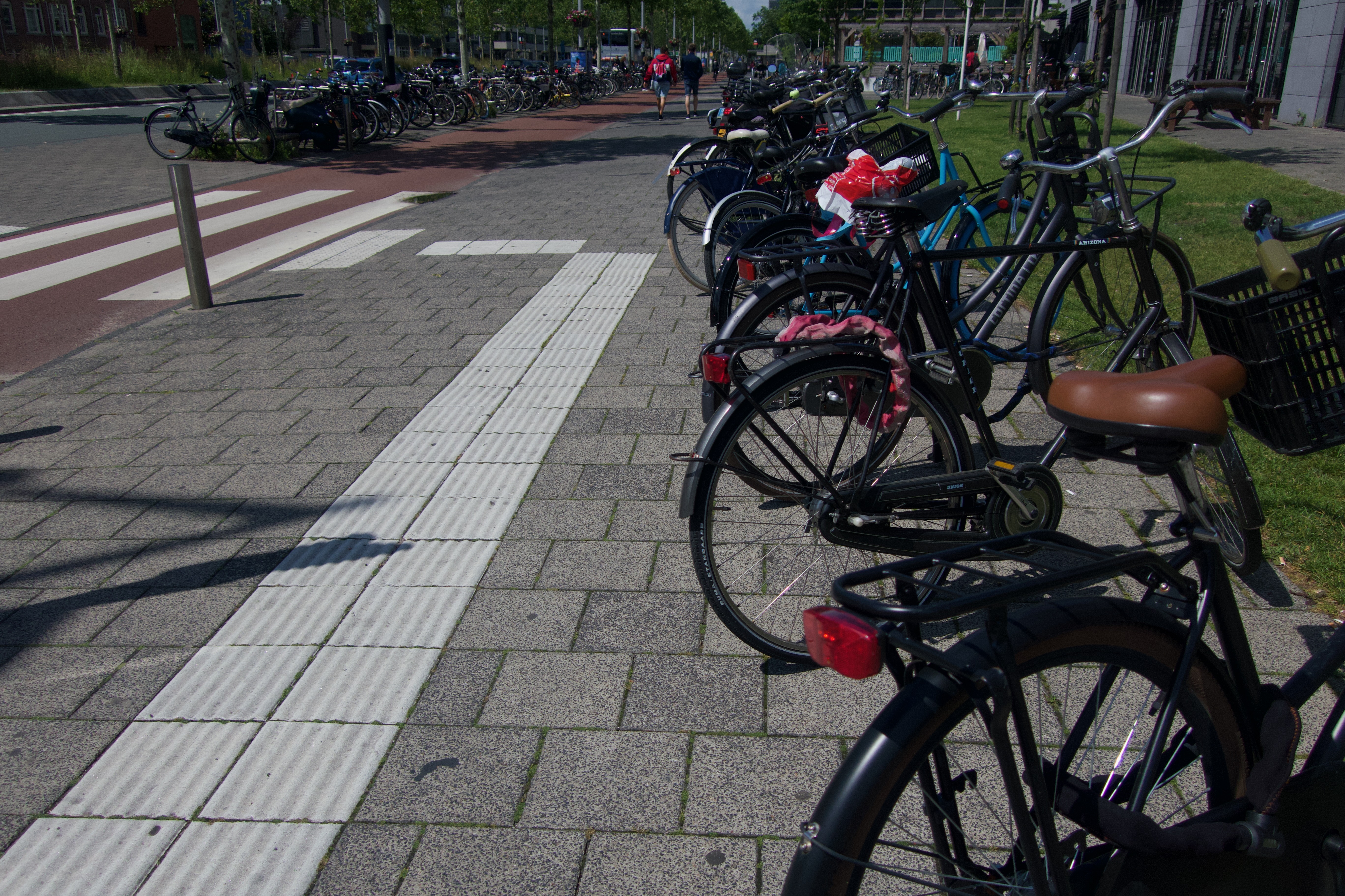 This photograph captures a row of parked bicycles along a well-maintained sidewalk, inviting a sense of community and daily life. The bright sunlight casts dynamic shadows, enhancing the textures of the pavement and emphasizing the chrome and colors of the bikes. In the background, blurred figures move leisurely, suggesting a vibrant atmosphere and the ease of urban mobility.