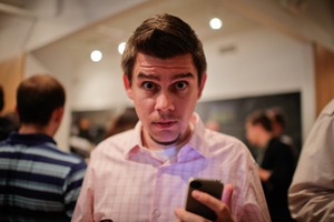 The photograph captures a man in a light pink checkered shirt, holding a phone with a look of surprise or confusion on his face. Soft lighting accentuates his features, while the blurred background suggests a busy social gathering, adding to the mood of intrigue and engagement. This composition draws focus on his moment of contemplation in a dynamic environment.