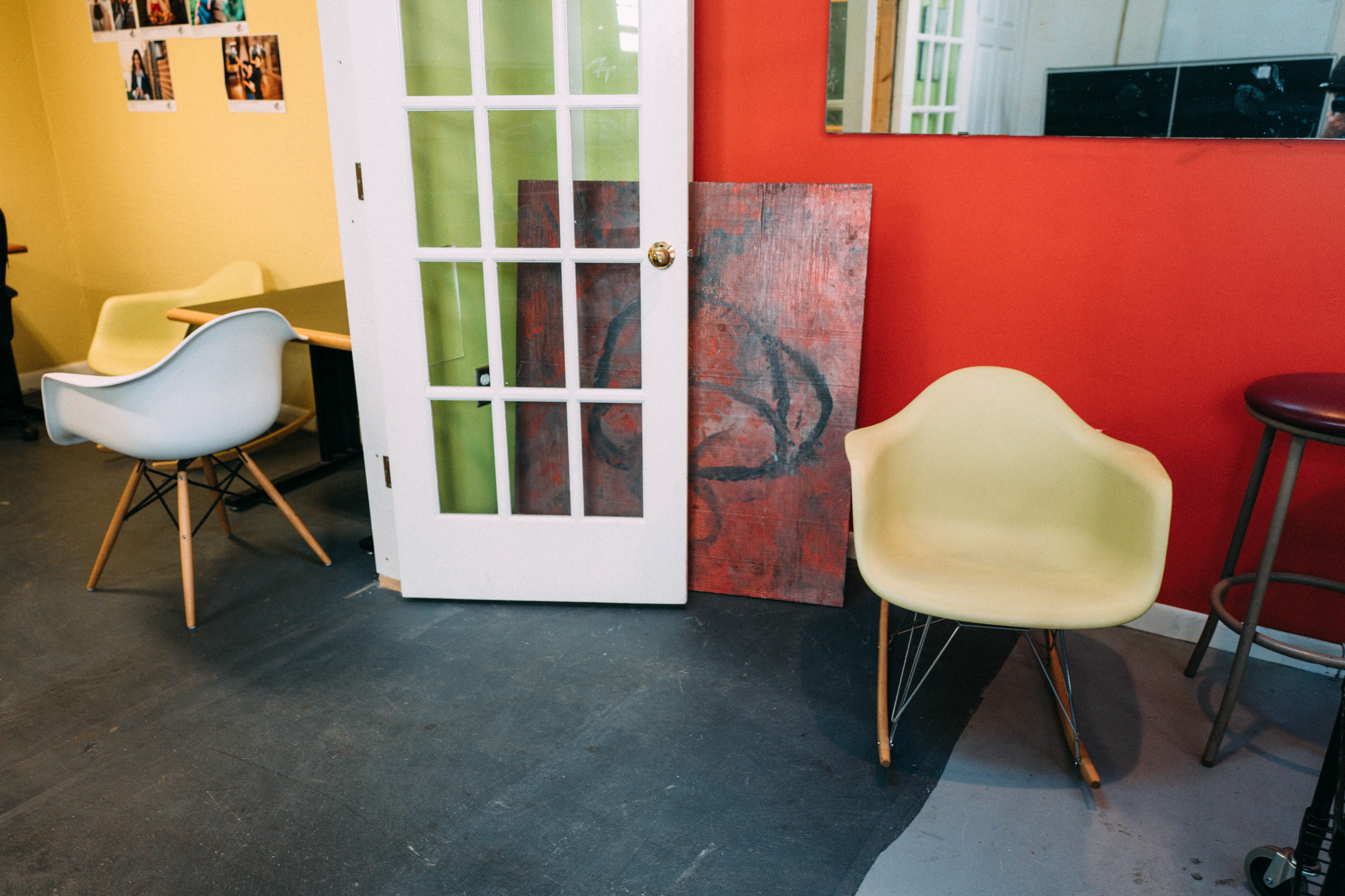 This photograph captures a vibrant workspace featuring an eclectic mix of furniture and art. The contrasting colors of the red wall and green door invite an energetic mood, while soft natural light bathes the scene, highlighting the textures of the chairs and the artwork. A sense of warmth and creativity permeates the space, offering a glimpse into an inviting environment for artistic endeavors.