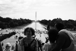 In this black-and-white capture, a mix of tourists gathers near a prominent monument, creating a lively yet contemplative atmosphere. The foreground features a woman with a gentle smile, while the background reveals a bustling scene complemented by the iconic Washington Monument framed by lush greenery. Soft, diffused light adds a timeless quality, enhancing the sense of connection among the visitors.