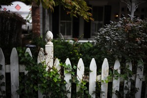This photograph captures a charming white picket fence, adorned with lush ivy and set against a backdrop of a hazy, inviting home. The soft, diffused lighting creates a serene atmosphere, evoking a sense of tranquility and nostalgia. The composition draws the eye to the intricately detailed fence post, symbolizing the blend of nature and homely warmth.