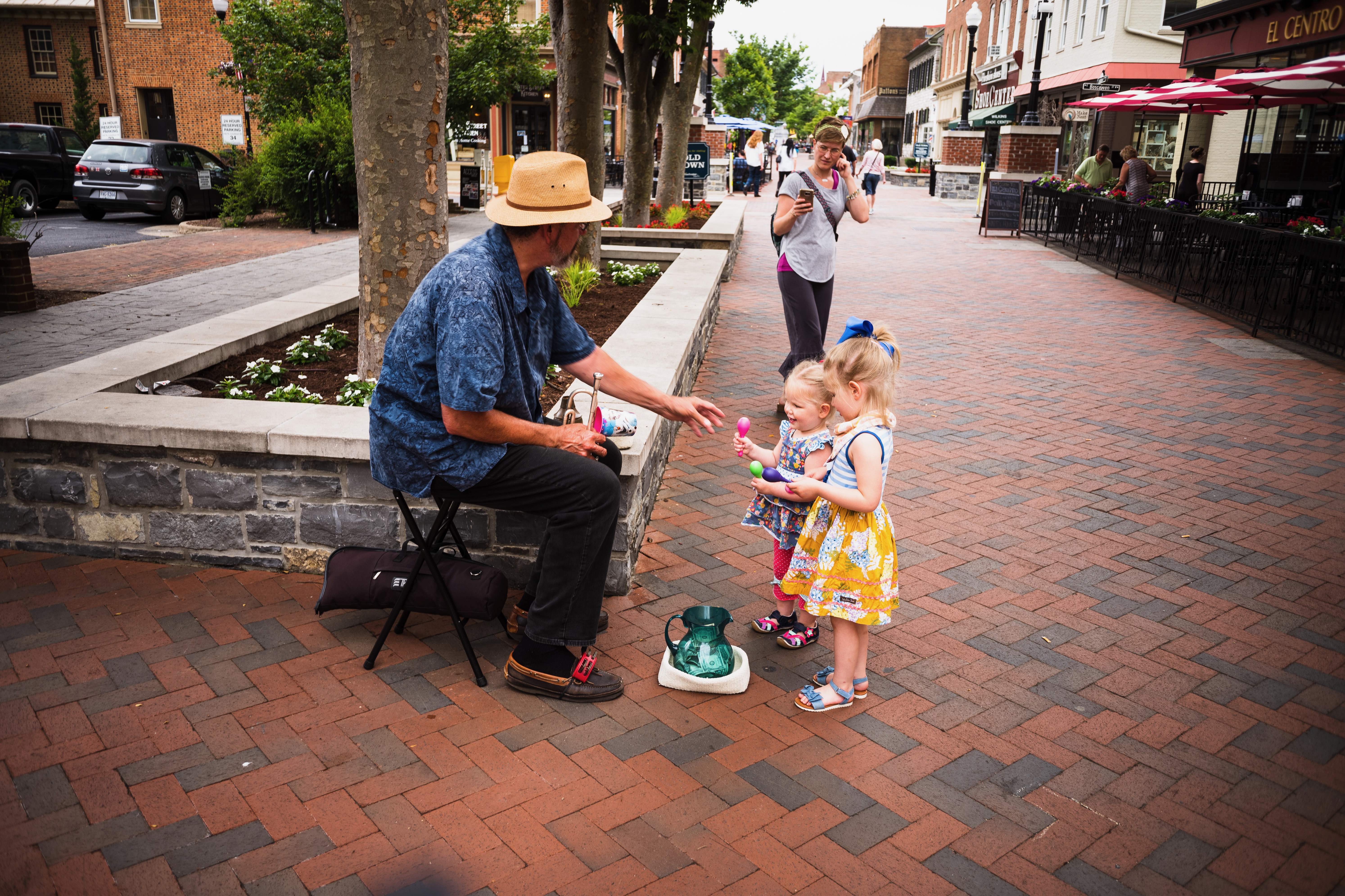 In this lively street scene, a man in a straw hat engages two young girls with colorful toys, radiating warmth and joy. The composition captures the innocence of childhood against a backdrop of charming shops and greenery, enhanced by soft, natural light. The atmosphere is playful and inviting, showcasing a moment of connection in a bustling community space.