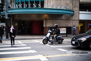 The photograph captures a moment of urban life at a bustling intersection, where a woman in a mask walks confidently across the crosswalk while a motorcyclist waits patiently. The cool, muted tones of the surroundings contrast with the vibrant blue of the 'Gardens Parking' sign, evoking a sense of routine amidst the city’s quiet activity. The composition highlights the balance between pedestrian and vehicular movement, enveloped in early morning light that suggests a calm yet lively atmosphere.