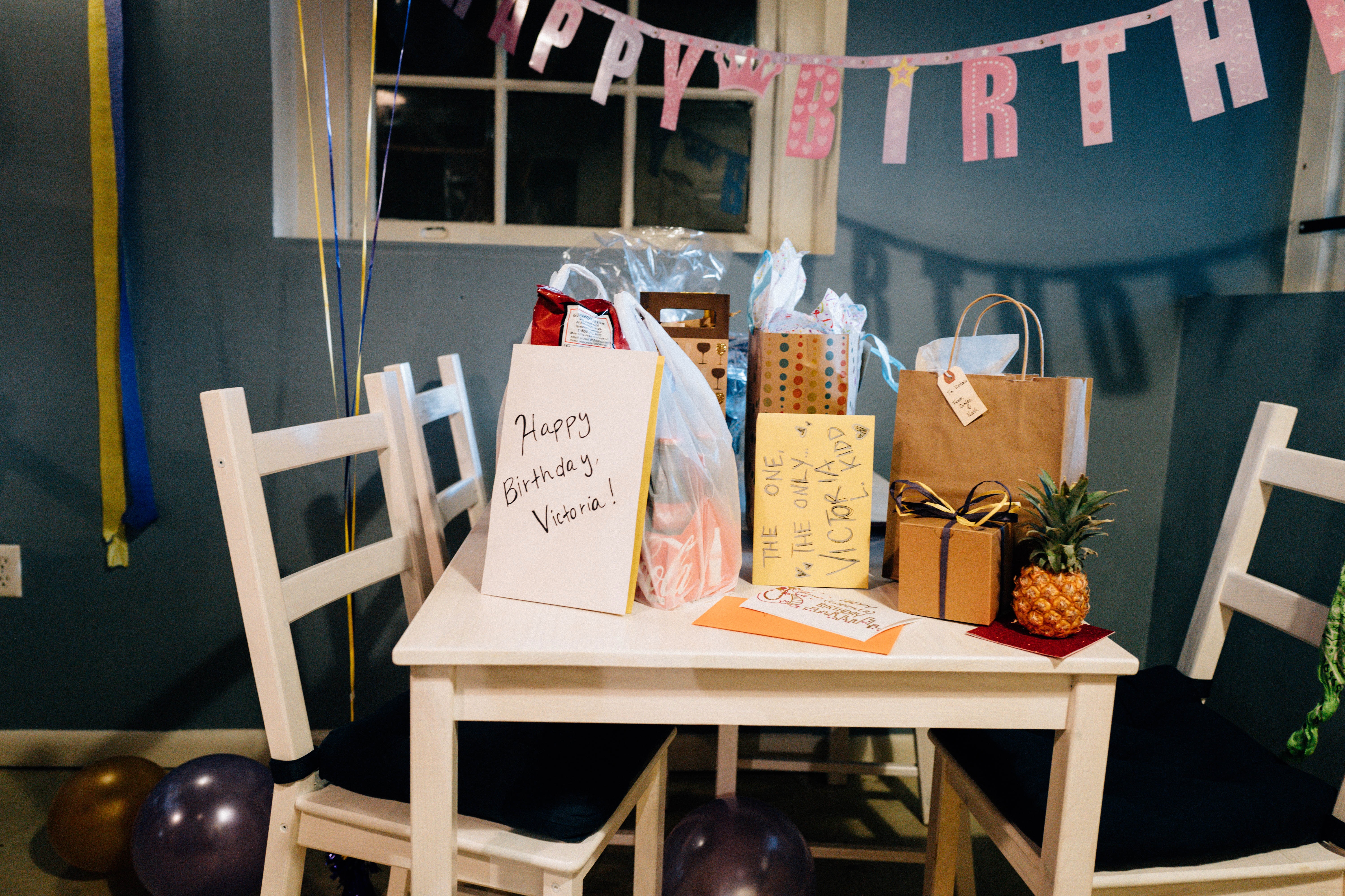 A cheerful birthday scene is captured, featuring a white table adorned with colorful gifts, cards, and a pineapple centerpiece. The ambient lighting casts a warm glow over the festive decorations, enhancing the joyful mood. A 'Happy Birthday' banner overhead adds a playful touch to the intimate celebration.