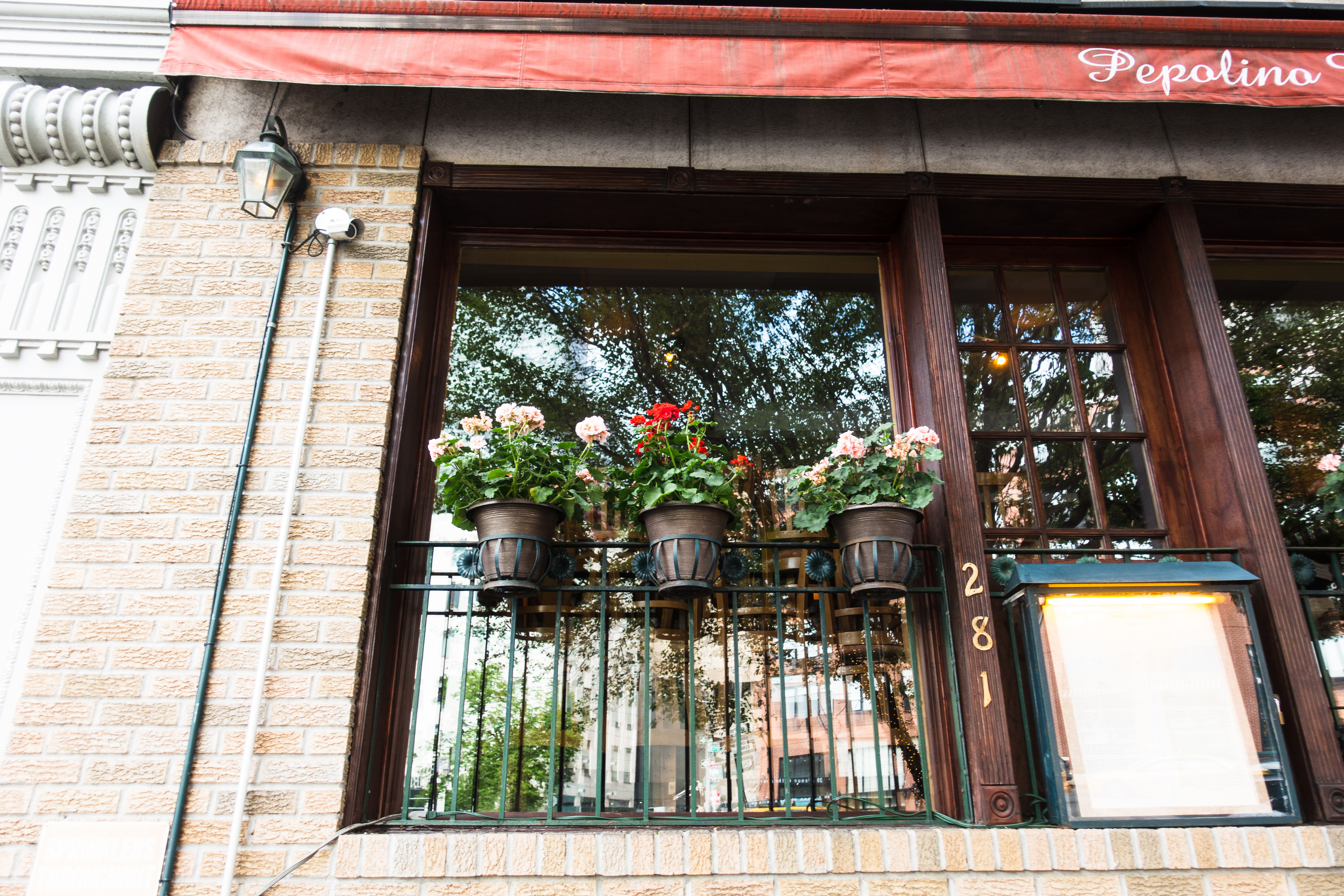 The photograph captures a charming cafe window adorned with vibrant flower pots, bringing a touch of nature to the urban scene. Soft, warm light reflects off the glass, creating a cozy and inviting atmosphere. The juxtaposition of the earthy florals against the structured brick facade evokes a sense of harmony and comfort.