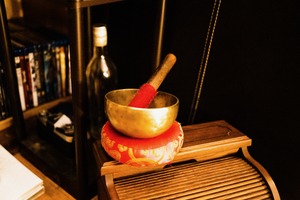 This photograph captures a brass singing bowl resting upon a vibrant cushion, exuding a sense of calm and introspection. The warm, dim lighting creates a cozy ambiance, while the soft textures of the wooden surfaces and the contrasting colors draw the eye to the bowl, inviting contemplation. In the background, hints of a personal space are visible, adding depth and a sense of intimacy to the scene.