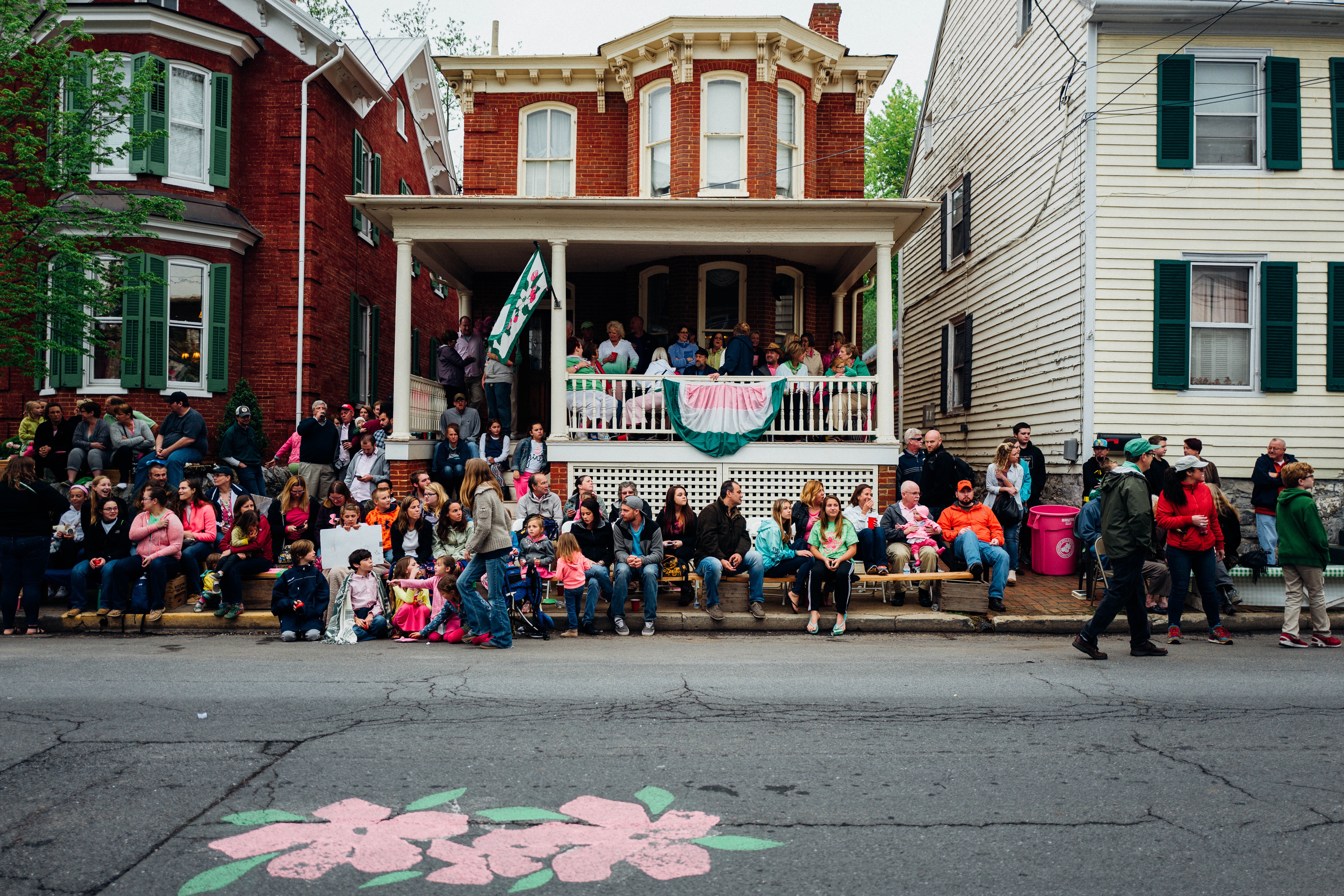 A lively gathering unfolds on a quaint street, with a diverse crowd of families and friends seated on steps and benches. The scene is filled with a sense of camaraderie and anticipation, enhanced by the soft, diffuse lighting of an overcast day, while the festive decor hints at a local celebration. Vivid colors pop amidst the muted gray backdrop, creating a warm, inviting atmosphere.