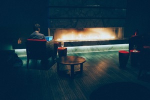 In a dimly lit lounge, a solitary figure sits absorbed in their laptop, framed by the warm glow of a modern fireplace. The contrast between the flickering flames and the surrounding shadows creates an intimate ambiance, evoking a sense of tranquil solitude. A round wooden table and stylish red accents add depth to the composition, enhancing the mood of calm contemplation.