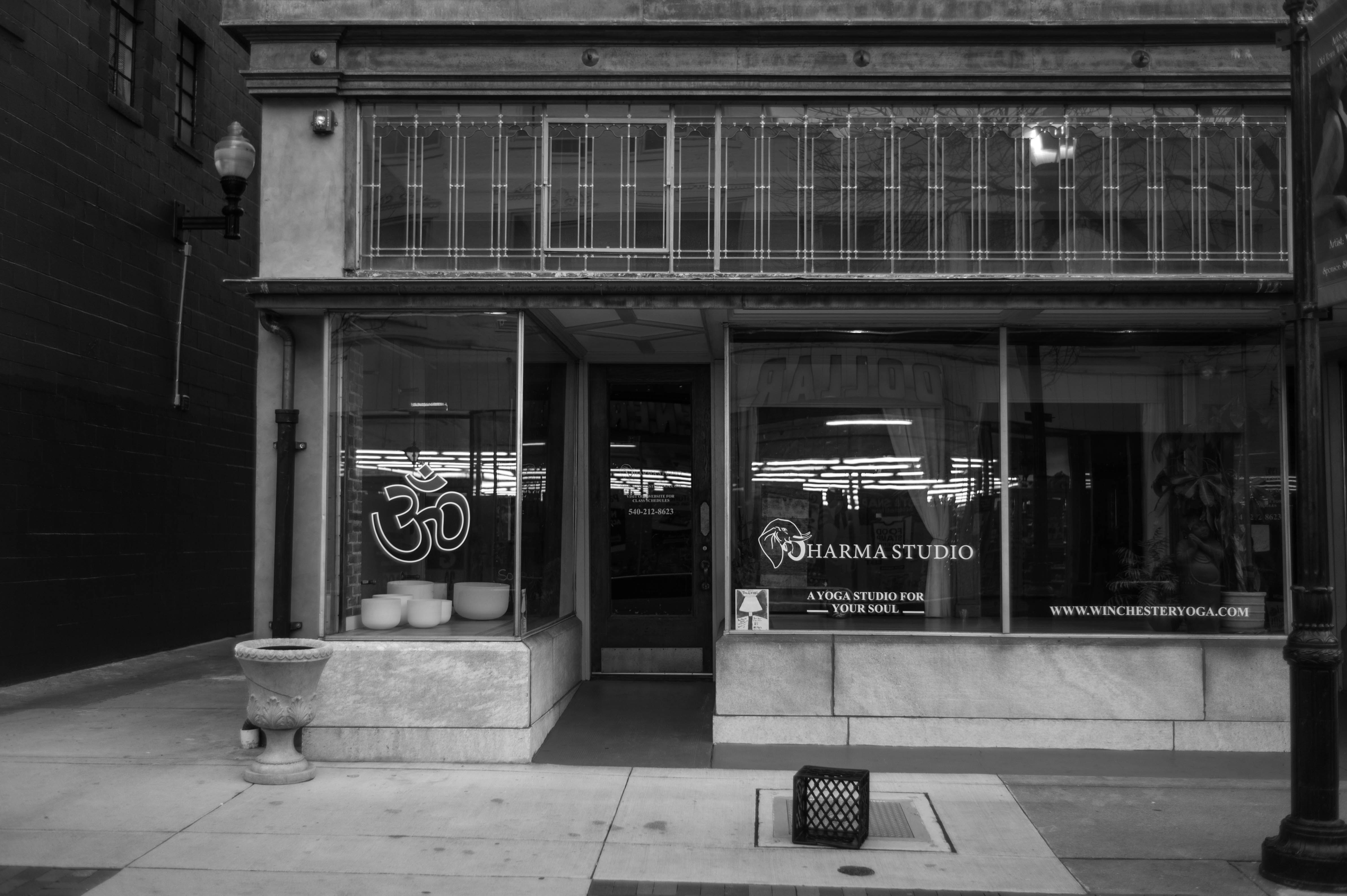 The photograph captures the inviting entrance of Dharma Studio, a yoga space, rendered in striking black and white. Soft ambient light glows through the glass windows, highlighting the serene, minimalist aesthetic of the storefront. The mood is tranquil and reflective, encouraging curiosity about the peaceful activities within.