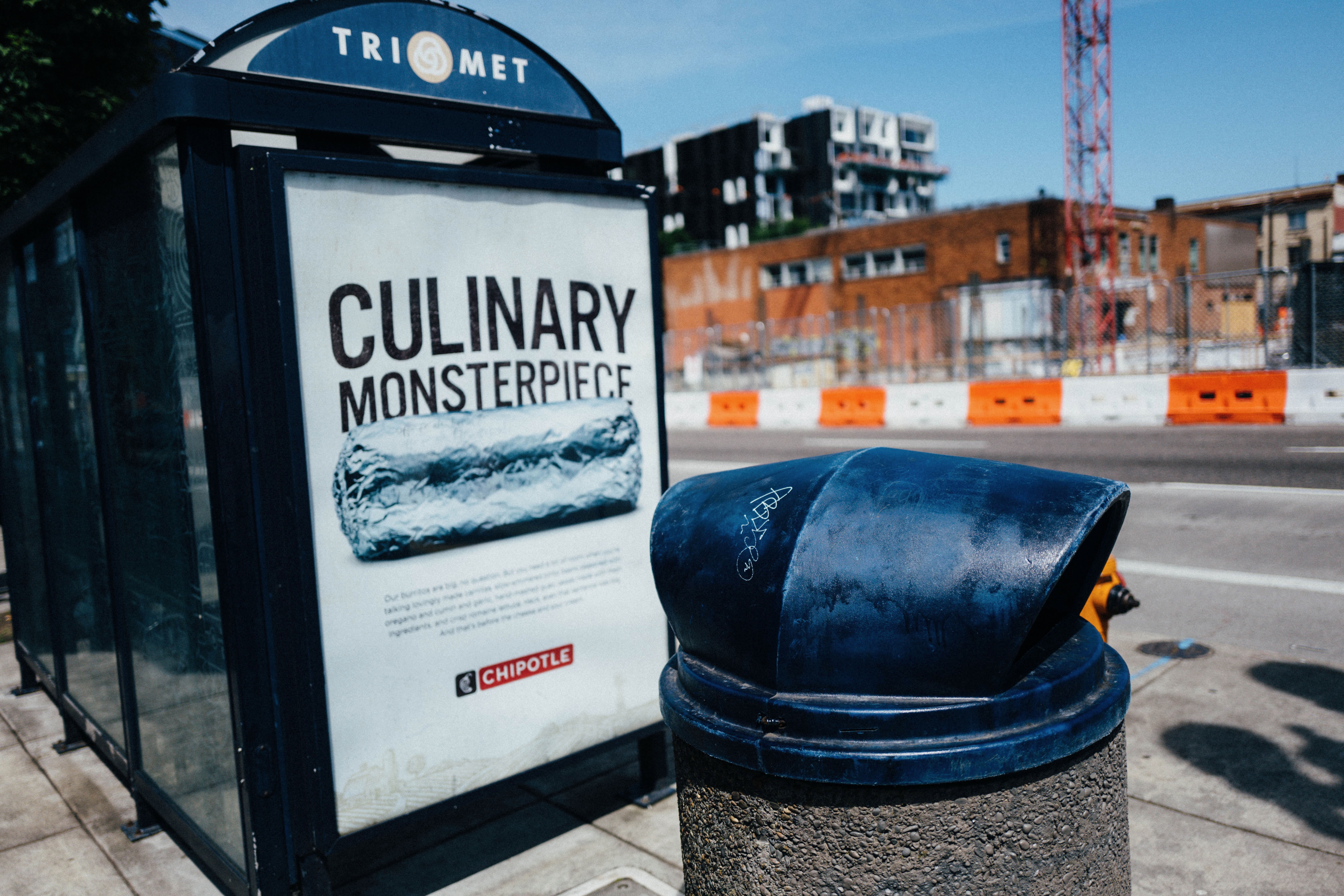 This photograph captures a bus shelter adorned with an advertisement for a culinary creation next to an unremarkable blue trash can, symbolizing a playful contrast between high and low culture. The bright sunlight casts sharp shadows, enhancing the vibrant colors and urban textures, while the construction site in the background hints at a city in transition. The scene evokes a witty commentary on consumerism and the overlooked details of everyday life.