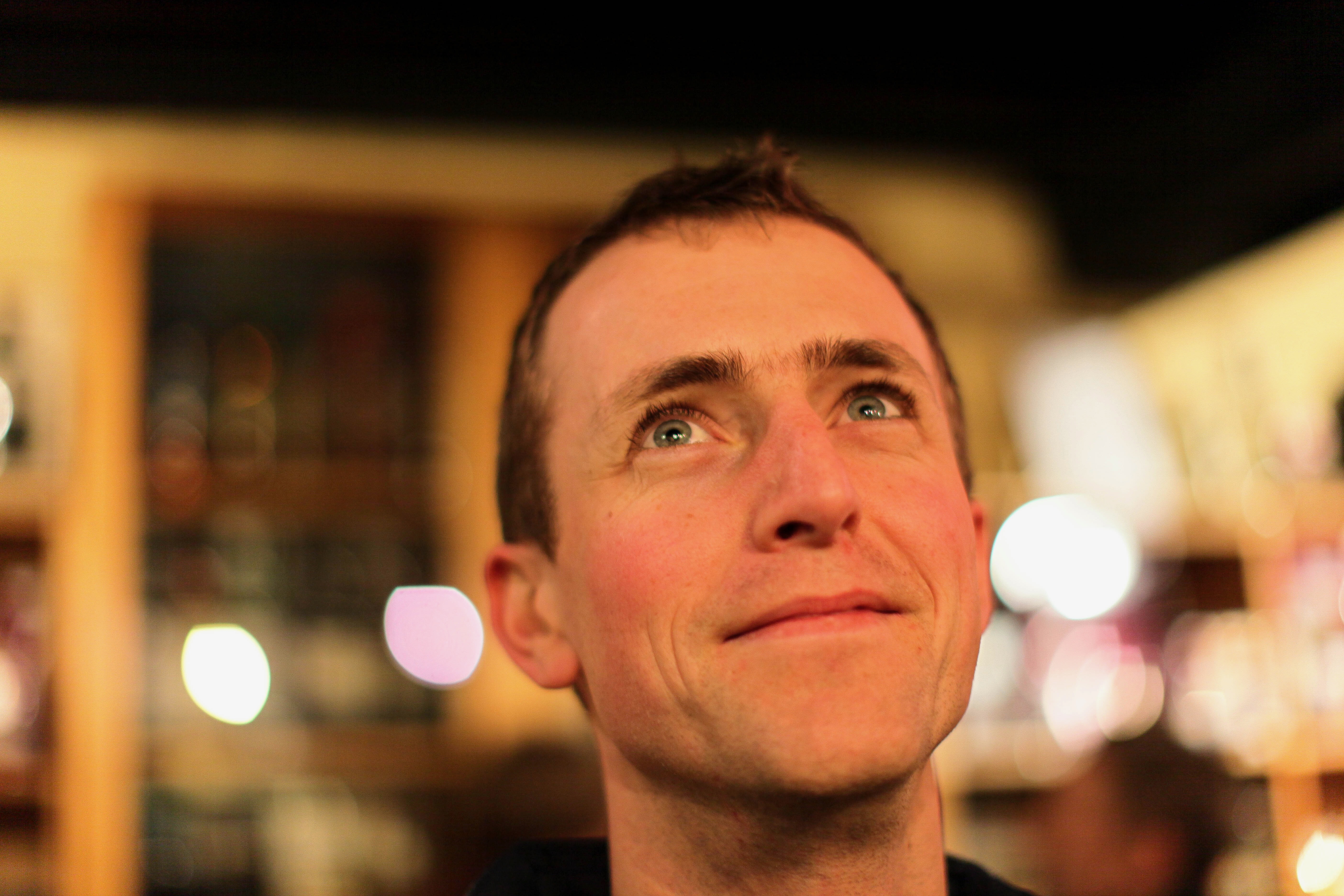 In a softly lit bar, a man with an optimistic expression gazes upwards, his eyes reflecting a sense of wonder. The warm ambient light blurs into a bokeh effect in the background, adding depth and intimacy to the scene. The composition draws the viewer's attention to his hopeful demeanor, creating a mood of contemplation and possibility.