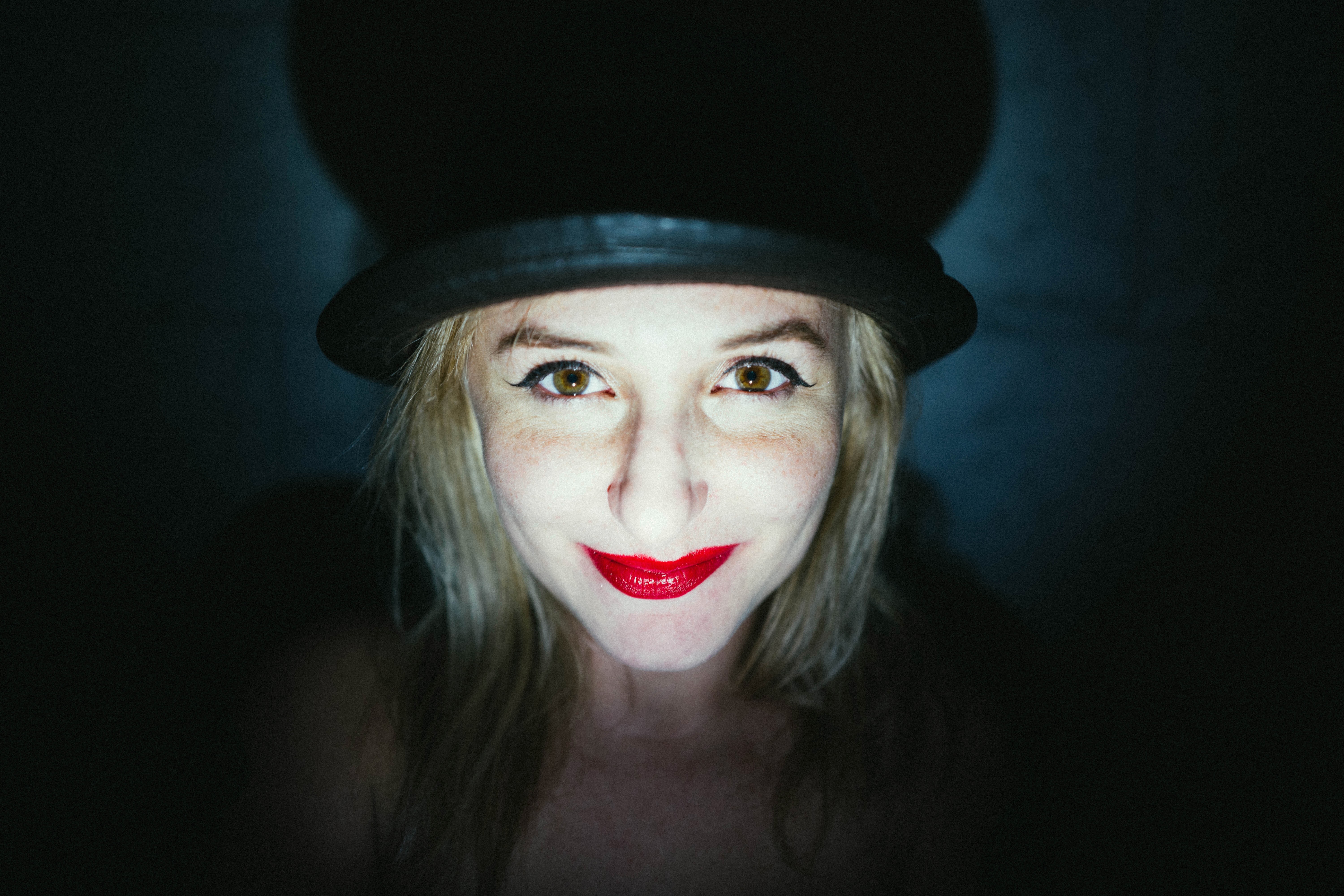 The photograph captures a woman with a captivating smile, framed by a dark background that enhances her striking features. The lighting is dramatic, spotlighting her bright red lips and expressive eyes, creating an eerie yet alluring mood. The composition draws the viewer's focus to her face, emphasizing the playful contrast between her hat and the shadows surrounding her.