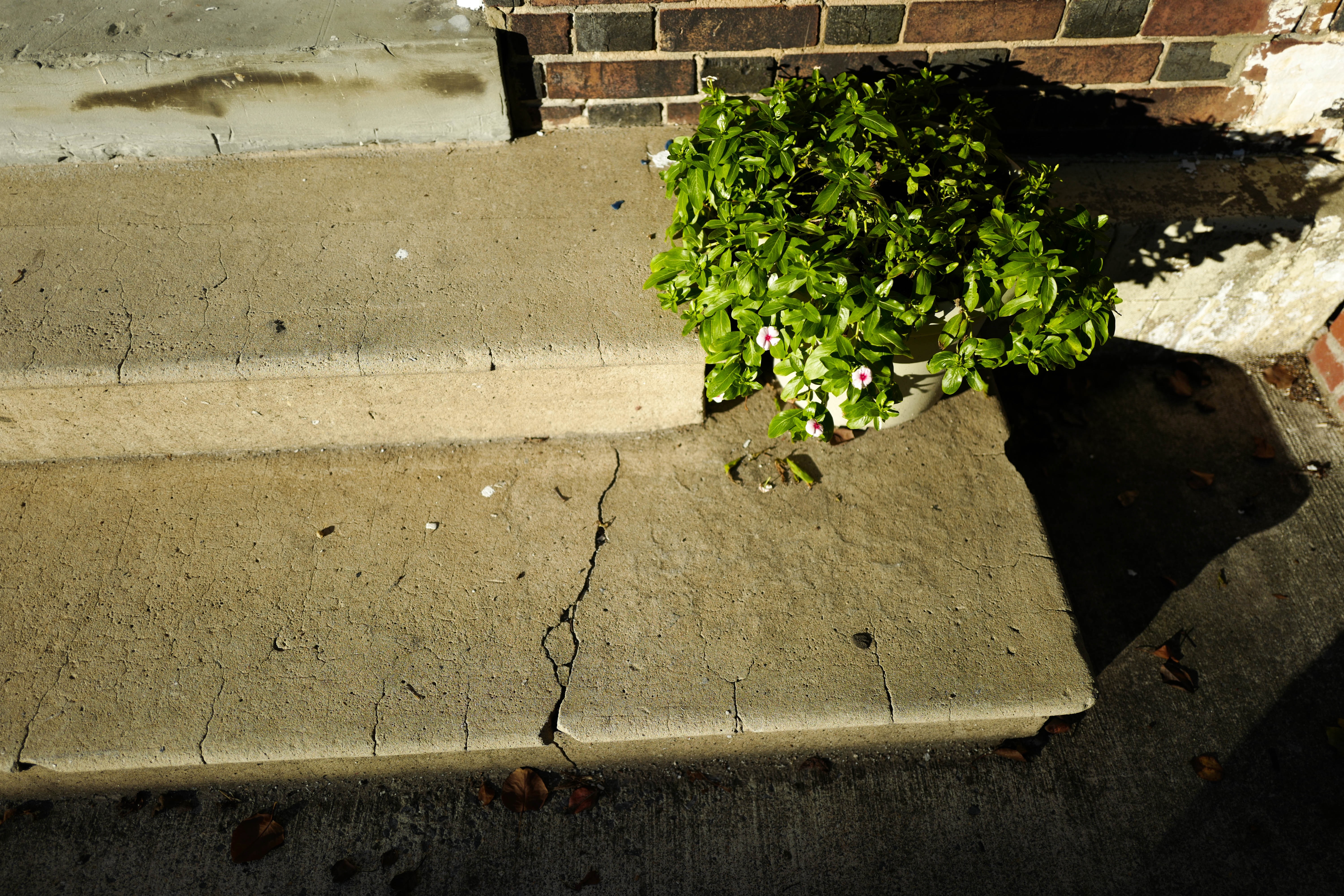 A vibrant green potted plant contrasts sharply with the worn, cracked concrete steps beneath it. The soft afternoon light casts gentle shadows, creating a warm, inviting mood that highlights the plant's delicate flowers. The composition captures a moment of life amid the weathering of the surroundings, evoking a sense of quiet resilience.