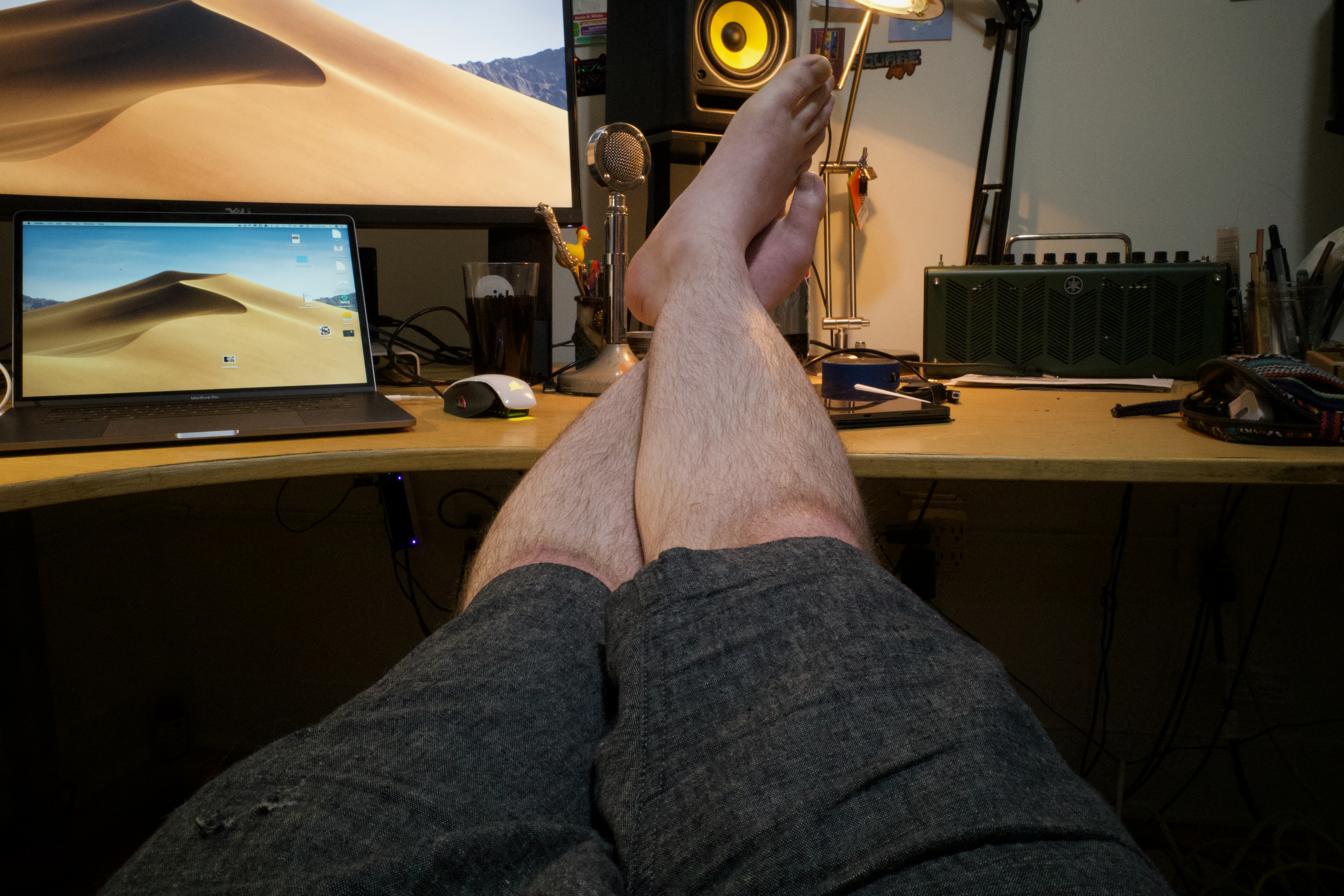 The photograph captures a relaxed scene where a pair of bare feet rests casually on a cluttered desk, revealing a home workspace filled with technology and creative tools. Warm lighting casts a soft glow, enhancing the casual, intimate mood of the environment. The contrasting background of serene dunes on the laptop screen juxtaposes the busyness of the desk, inviting a sense of tranquility amid productivity.