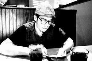 In this black-and-white photograph, a man sits at a café table, engrossed in his phone, casting a pensive mood. His muted attire and the soft, diffused lighting create an intimate atmosphere that contrasts with the dark wooden backdrop. The two glasses of drink beside him add depth to the composition, emphasizing a sense of solitude amidst a bustling environment.