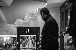 In this monochromatic photograph, a solitary figure leans over a railing, gazing down toward the GAP store below. The geometric lines and angular shapes of the architecture create a modern, contemplative atmosphere, contrasting with the bustling retail scene just out of focus. The interplay of light and shadow enhances the mood, emphasizing a sense of introspection amidst urban consumerism.