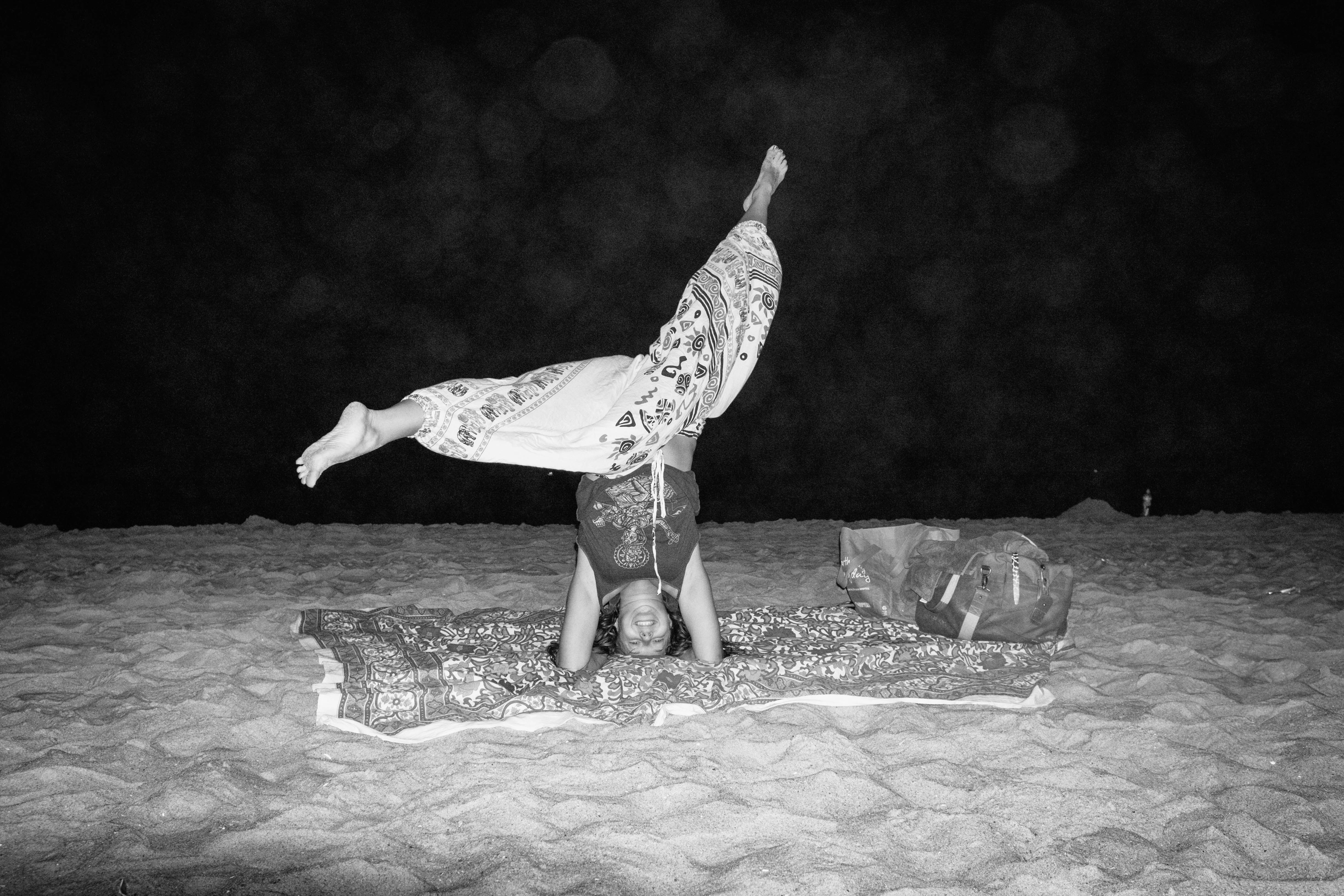 In a striking black and white composition, a woman performs a handstand on a patterned blanket laid on sandy beach. The contrast between her figure and the dark night evokes a sense of focus and tranquility, while the layered textures of fabric and sand create a grounding effect. The scene captures a moment of playful freedom under the vast, shadowy expanse of the night sky.