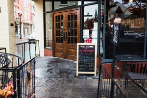 The photograph captures the inviting entrance of 'El Centro,' accented by a charming chalkboard sign detailing daily specials. Soft, diffused lighting highlights the cozy wooden door and slick pavement, suggesting a light drizzle has occurred. The composition draws the eye towards the doorway, creating an atmosphere of warmth and accessibility amidst an urban setting.