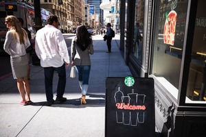 The photograph captures a bustling street scene where a couple walks hand in hand, framed by the urban architecture of a vibrant city. Sunlight casts sharp shadows, enhancing the sense of movement and activity, while a welcoming Starbucks sign adds an inviting pop of color. The mood is casual and lively, reflecting the dynamic daily life of city dwellers.