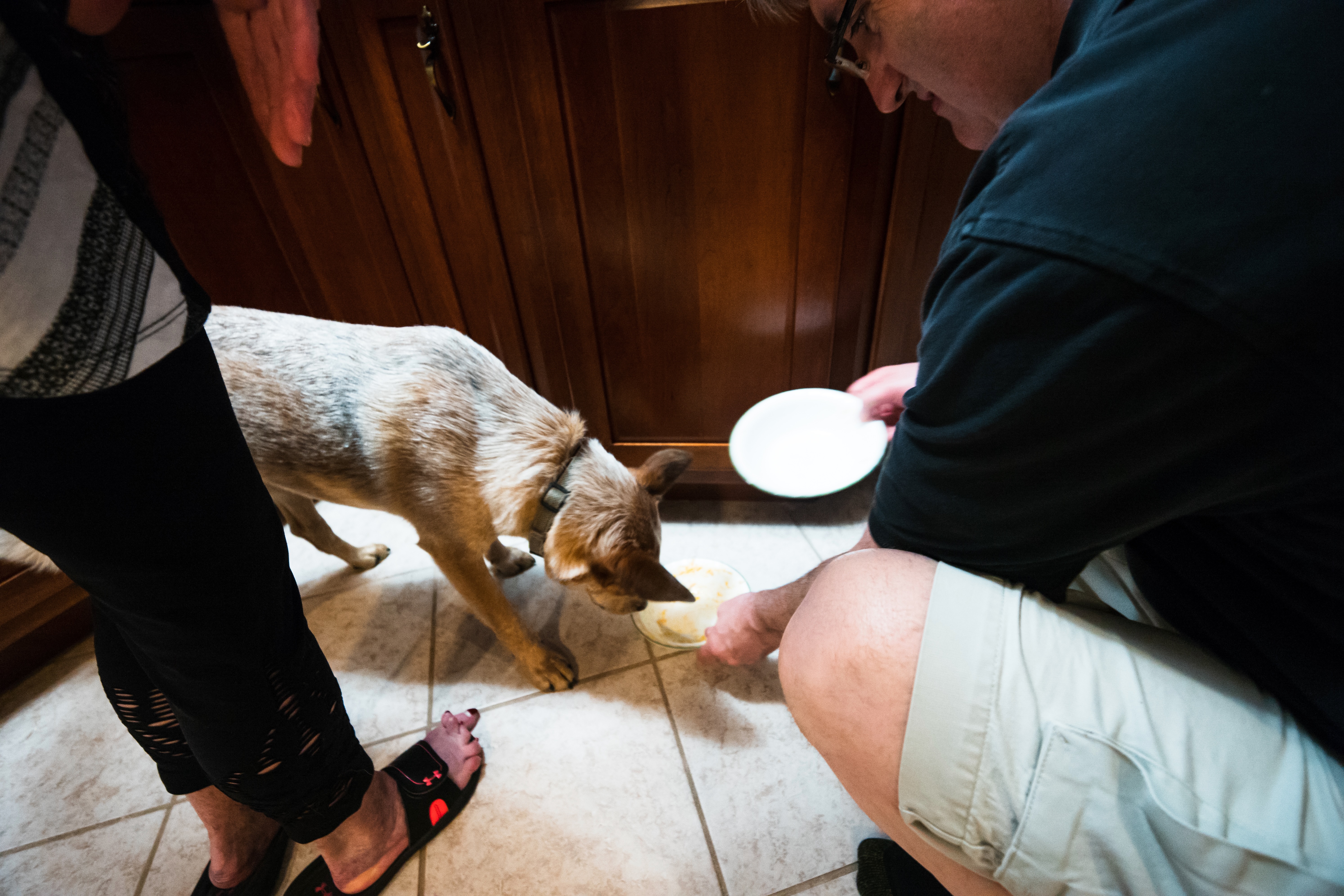 In a cozy kitchen setting, a playful dog leans over a bowl as a man carefully serves food nearby. The warm wooden tones of the cabinets create a homely atmosphere, highlighting the intimate bond between pet and owner. Gentle, natural light streams in, enhancing the casual, loving mood of the moment.