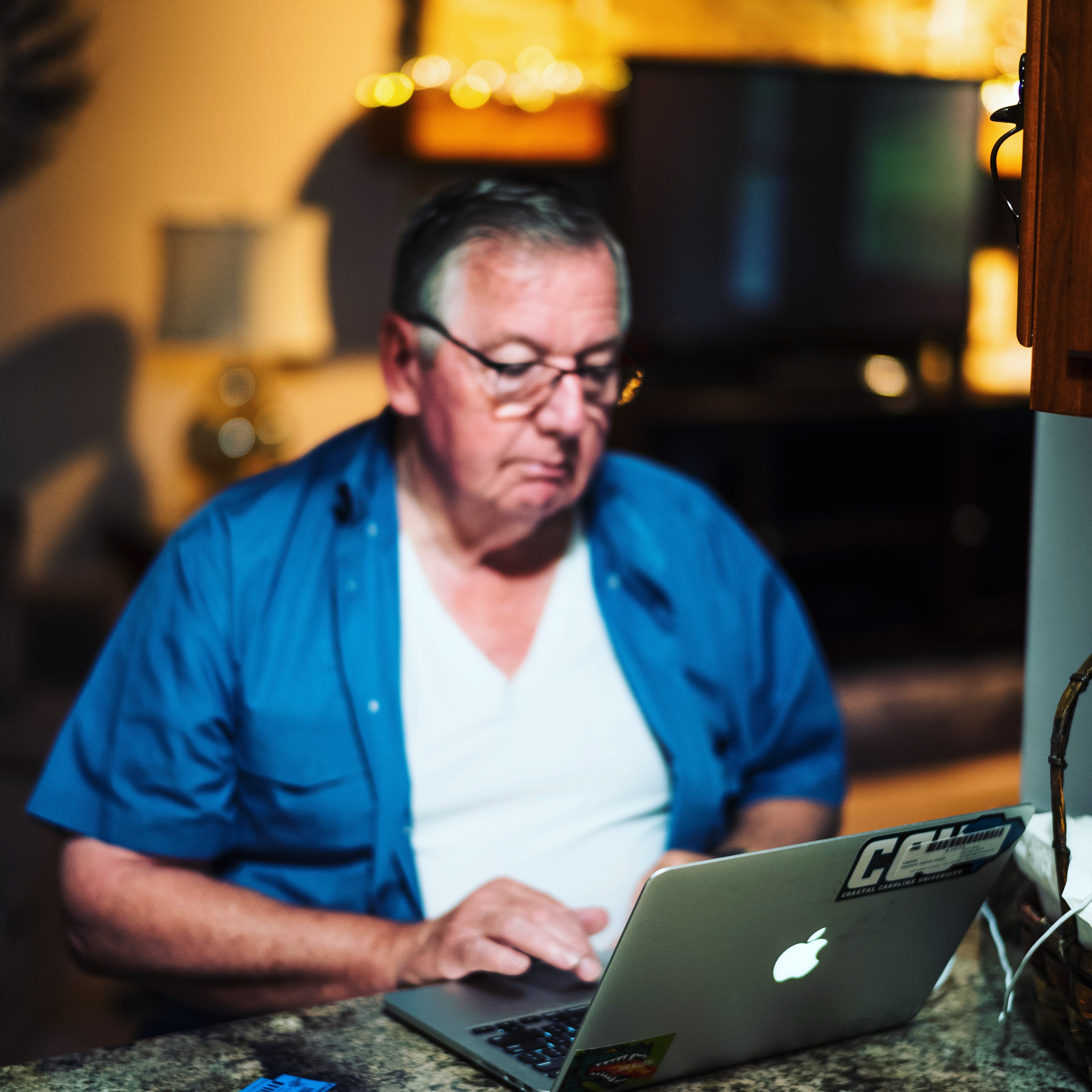 The photograph captures an elderly man engrossed in work on his laptop, his thoughtful expression illuminated by soft ambient light. The cozy kitchen setting, hinted at by blurred outlines of furniture and decorative elements, creates a warm atmosphere that contrasts with the intensity of his concentration. The composition draws the viewer's eye to the subject, highlighting a moment of quiet determination in an everyday environment.