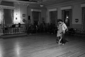 In a dimly lit dance hall, a couple sways closely, lost in their own world amidst the stillness of the night. Their embrace radiates warmth against the coldness of the barren space, where scattered chairs and onlookers create a sense of intimacy in the emptiness. The soft glow from overhead lights casts gentle shadows, enhancing the romantic mood and highlighting the elegance of their dance.