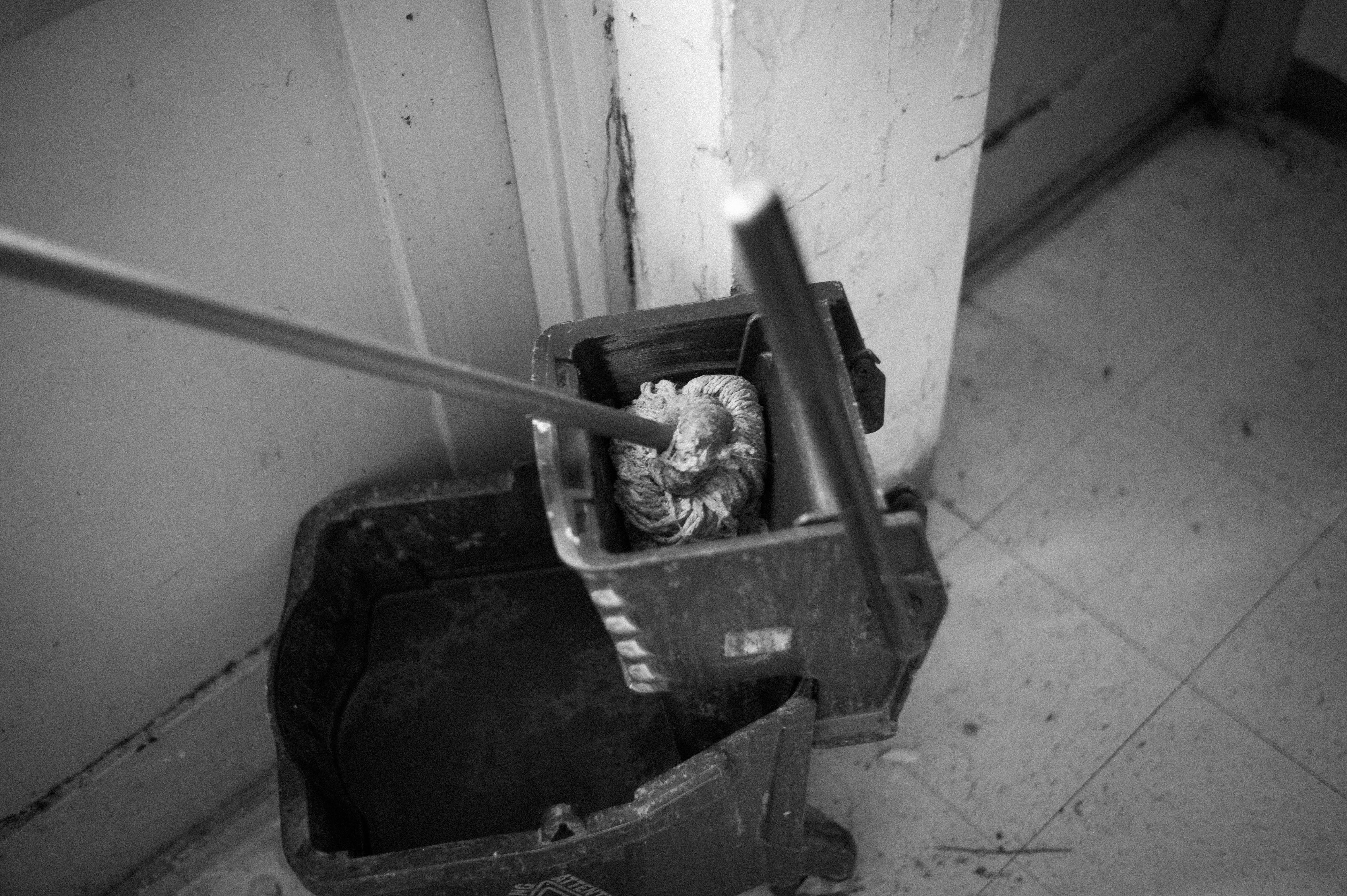 In this monochromatic composition, a mop rests in its bucket, evoking a sense of stillness and solitude. The lighting softly highlights the worn texture of the mop and the surfaces around it, creating a mood of quiet contemplation. The close-up perspective emphasizes the often-overlooked tools of daily labor, inviting viewers to reflect on the unnoticed moments of life.