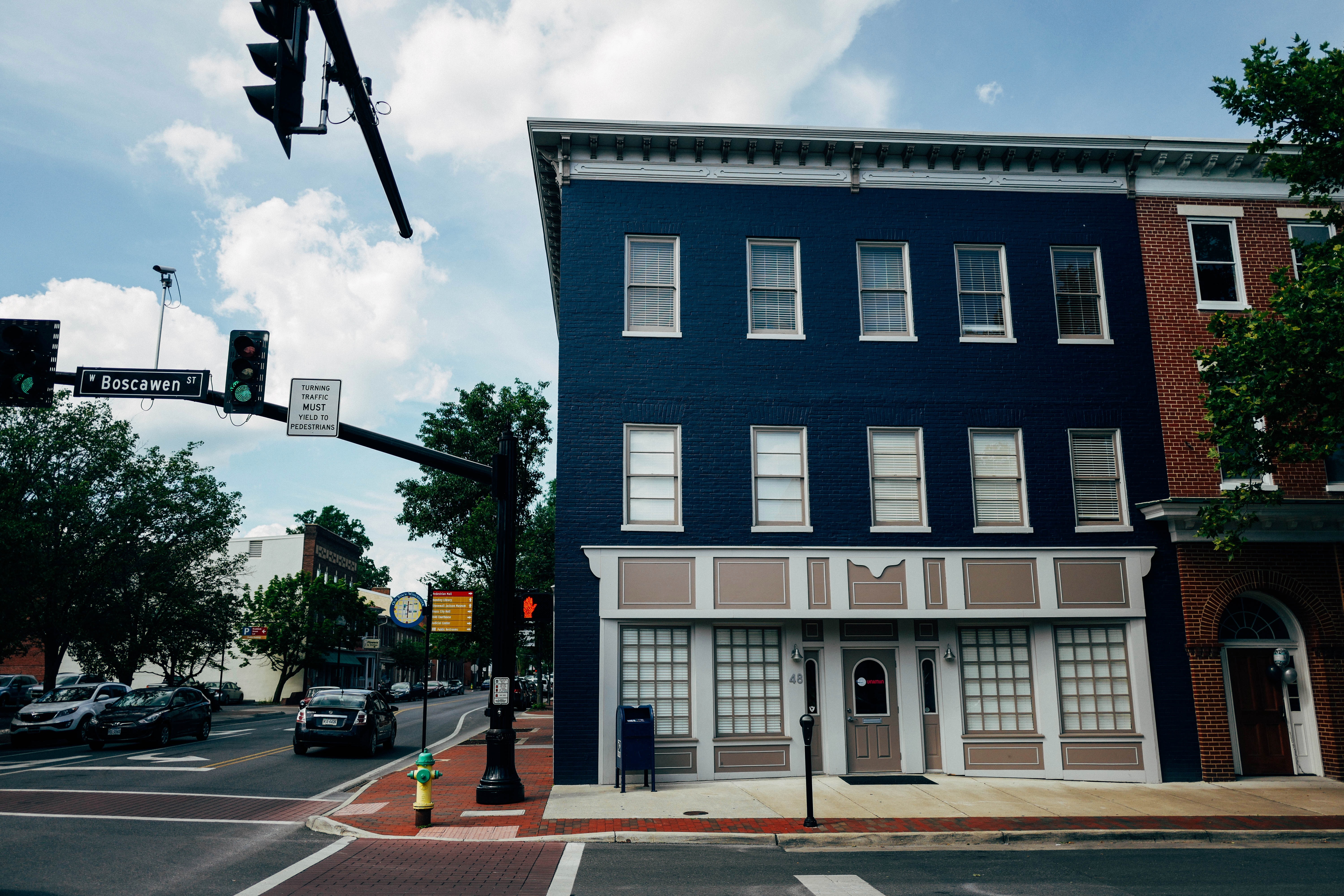 This photograph captures a striking corner of an urban street, featuring a blend of historic architecture with a bold blue facade. The cool lighting accentuates the textures of the building's surfaces, while the greenery and traffic signals add a vibrant, contemporary touch. The mood is relaxed yet lively, inviting exploration of the surroundings.