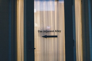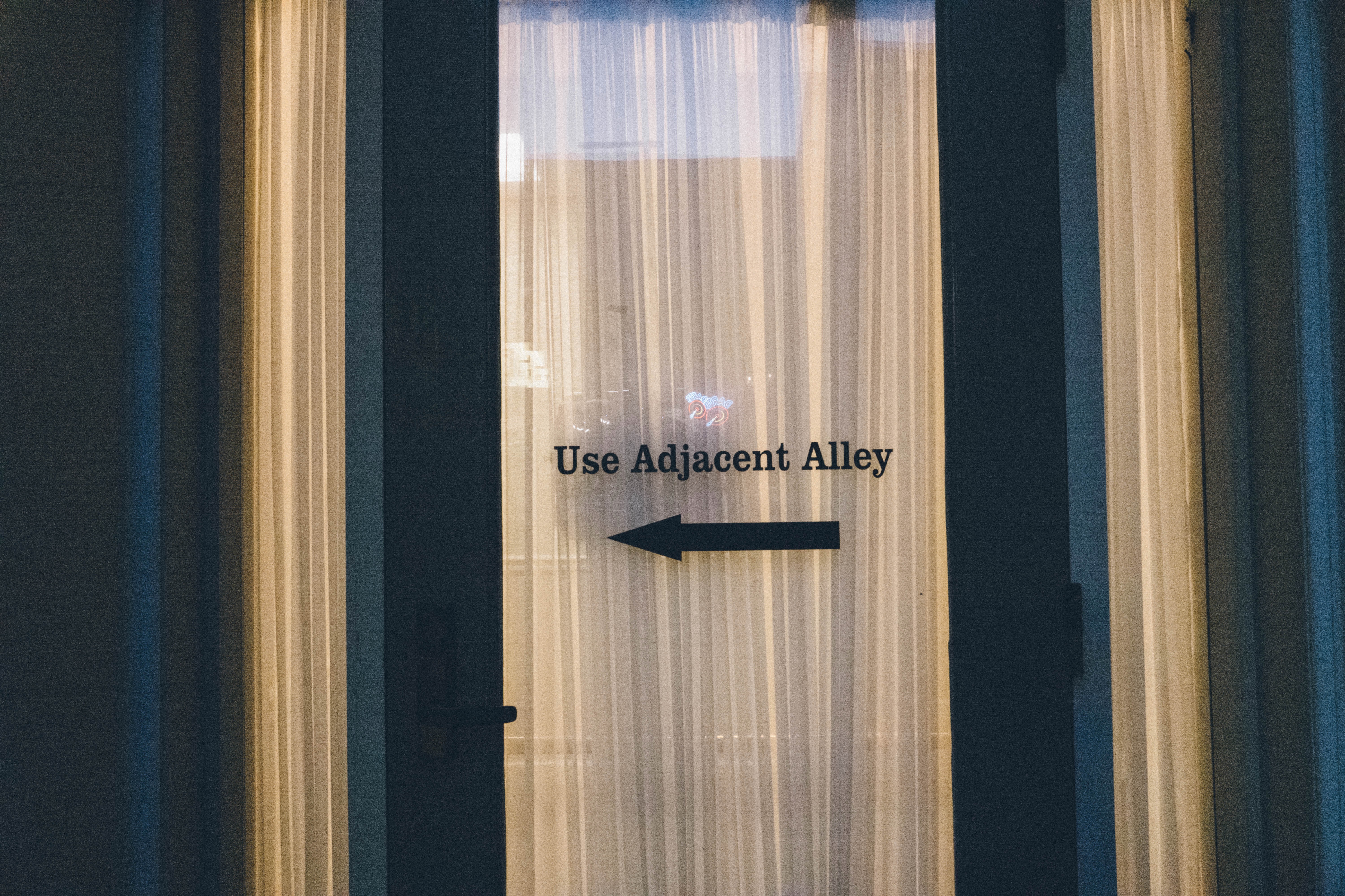 This photograph captures a doorway with sheer curtains softly illuminated from behind, creating a warm but uncertain ambiance. A clear directive, 'Use Adjacent Alley,' is boldly printed on the glass, its simplicity contrasting with the mysterious allure of the muted lighting. The overall composition evokes a sense of intrigue, inviting curiosity about what lies beyond the door.