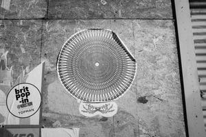 This black and white photograph captures an intriguing circular design mounted on a textured, wooden backdrop. The interplay of light and shadow creates a stark contrast, highlighting the intricate details of the circular pattern while the adjacent advertisements add layers of urban character. The overall mood is a contemplative blend of art and urban decay, inviting viewers to consider the stories behind each element.
