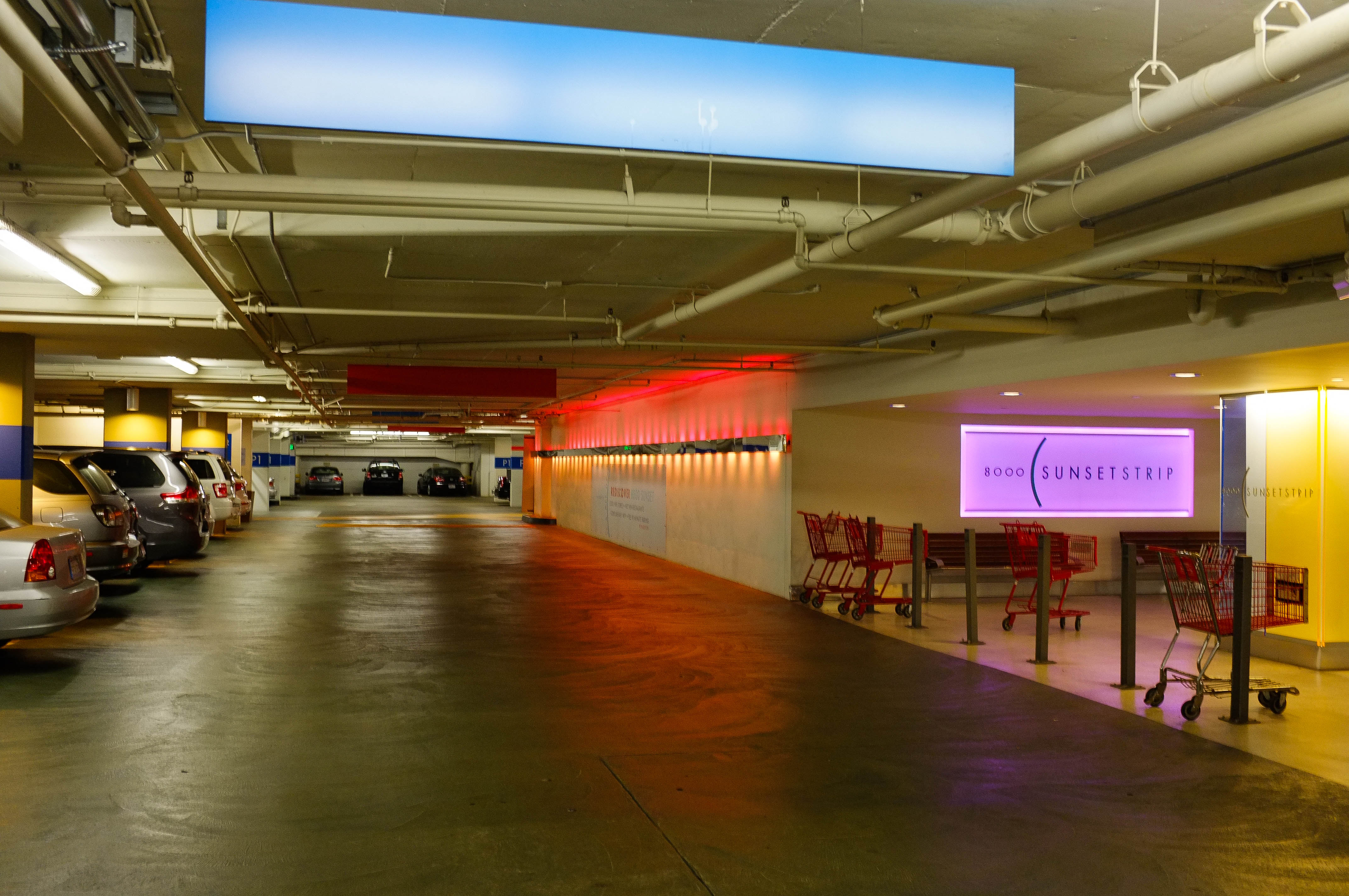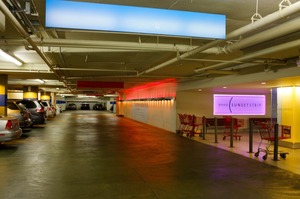 This photograph captures an empty parking garage, where subtle lighting plays a significant role. The cool blue and warm red hues create a serene yet slightly eerie atmosphere, enhancing the sense of isolation. Rows of parked cars on one side lead the eye toward a glowing entrance, evoking curiosity about the space beyond.