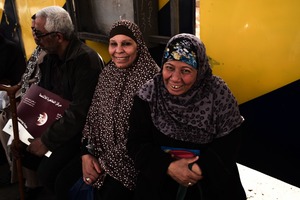 Two elderly women sit side by side, exuding warmth and joy in their vibrant scarves and smiles. The lively colors of their surroundings contrast with their serene expressions, creating an inviting atmosphere. The soft lighting captures the moments of camaraderie, highlighting the sense of connection and shared experience between them.