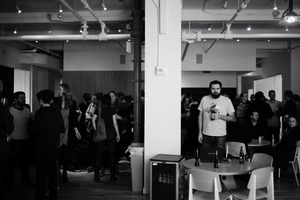 In a bustling room filled with mingling guests, a solitary figure stands in the foreground, his calm demeanor contrasting with the lively atmosphere around him. The stark black-and-white composition highlights the dynamic interplay of light and shadow, creating an introspective mood against the backdrop of social engagement. The subtle variations in lighting draw attention to the clusters of people, enhancing the sense of connection and community while emphasizing the subject's solitude.